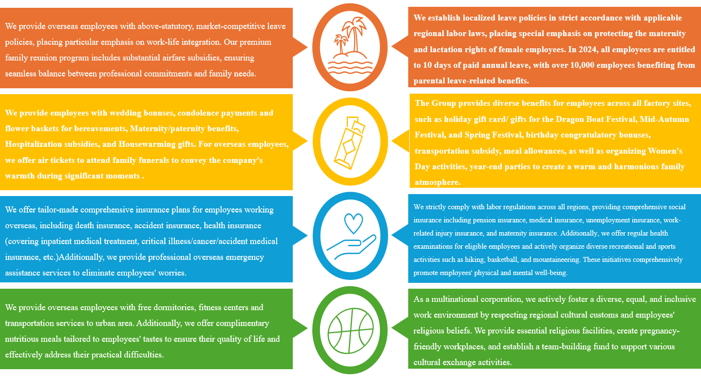 Talents are the core asset for Huali Group's sustainable development and the key to decision-making and operations. We consistently uphold the philosophy and spirit of "people-oriented, joyful shoemaking, technology-driven management, profit creation, generational inheritance, and sustainable operation." We are committed to providing a comfortable working environment and competitive compensation benefits, actively promoting all the employees are paid equally for work of equal value and equal opportunities, to attract and retain outstanding talents worldwide, jointly creating exceptional value and sharing the fruits of success.