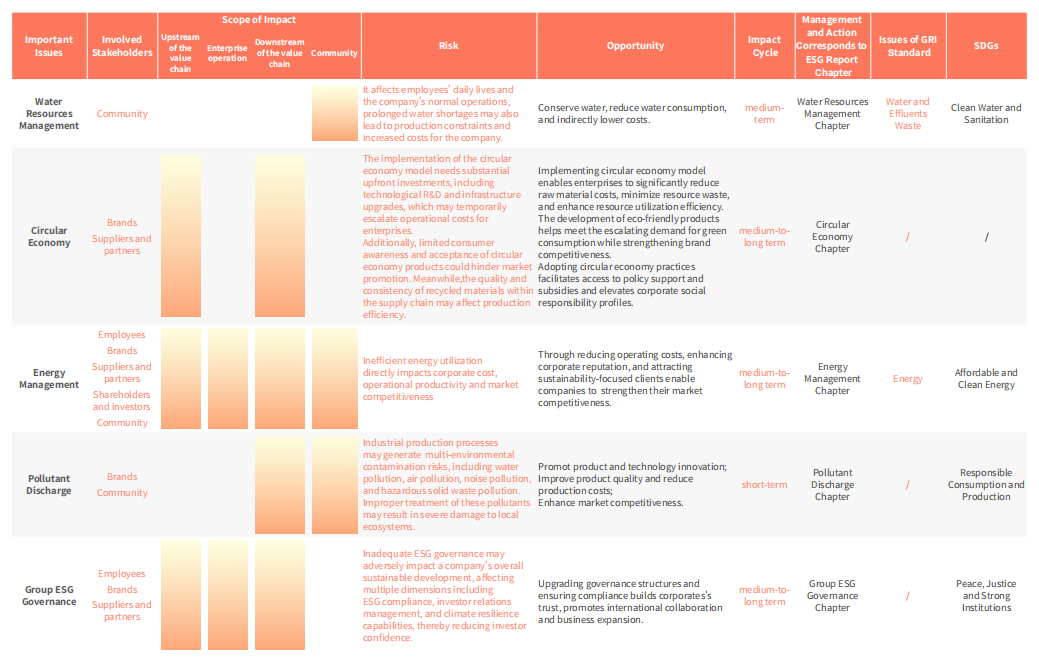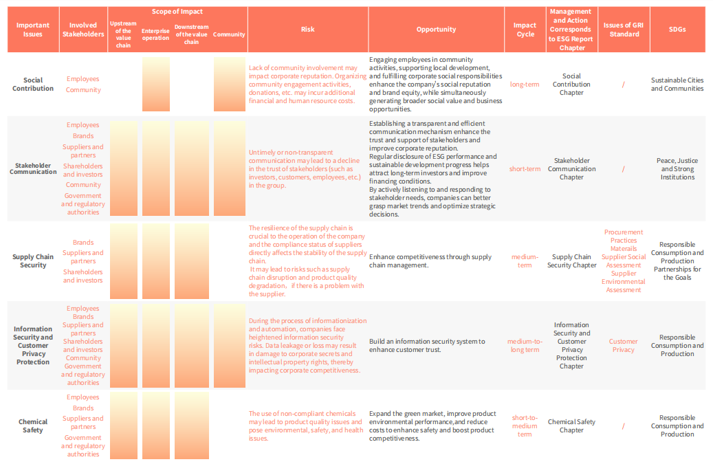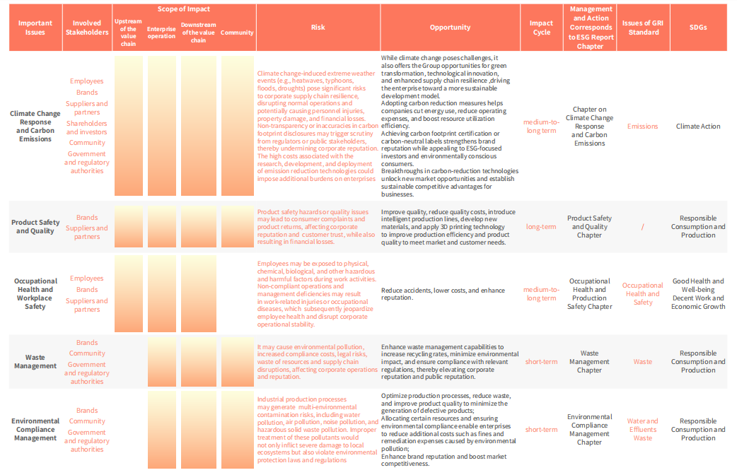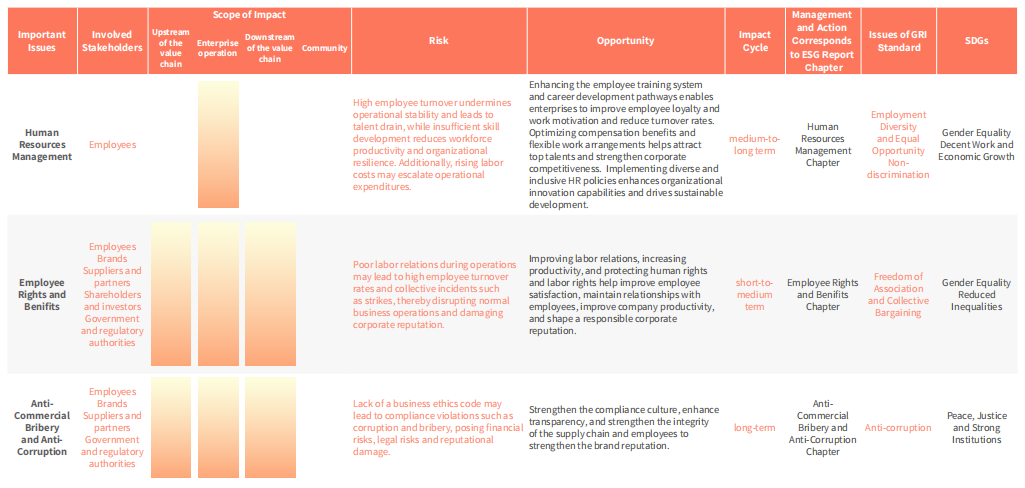 Huali Group, based on its 2024 Issues Matrix, implemented systematic risk and opportunity management for issues assessed as highly important .The Group disclosed relevant management measures and actions by assessing the scope of impact, risks and opportunities of these issues, and identifying affected stakeholders. In practice, the group strengthened full-process control over high-priority issues through its own risk management and internal control systems. While rigorously mitigating risks, it seized sustainable opportunities to drive long-term value creation.