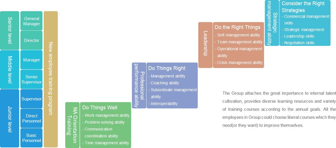 to the top; we provide a complete training system and development planning to improve professional management abilities and encourage employees to engage in self-development.Through the regular updating of the management training blueprint, the staff can follow the map, understand the professional knowledge required at each stage of the position, and work in four main directions: