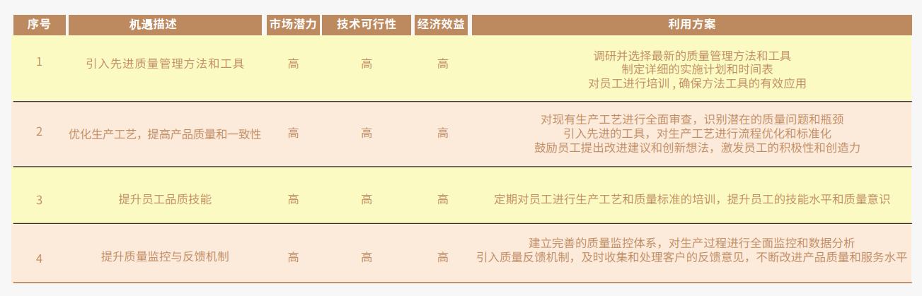 在品质方面的风险评估管理上,我们不仅关注风险,还积极识别机遇。通过深入分析市场需求、技术进步以及竞争对手的动态,我们能够发现潜在 的市场机遇和威胁所在。在此基础上,我们制定了一系列策略,旨在精准把握机遇,有效应对威胁,从而不断提升产品和服务的质量,确保满足并 超越客户的期望。