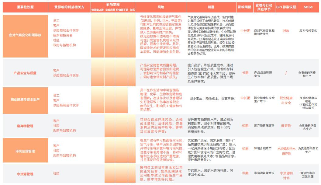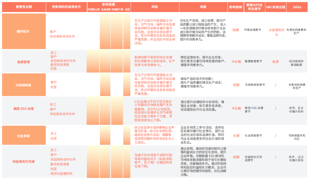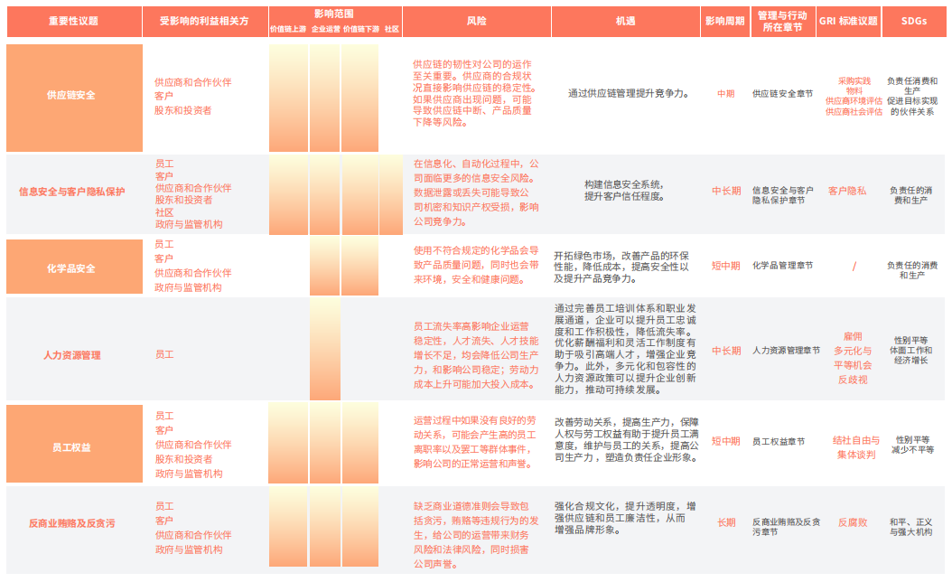 华利集团根据2024年度议题矩阵,针对重要性和评分较高的议题进行了系统性的风险和机遇管理,通过评估议题的影响范围、风险与机遇,并识别受影响的利益相关方,重点披露了相关管理措施和行动。同时在实践层面,集团依托现有风险管理与内部控制体系,强化对高优先级议题的全流程管控,在严格防范风险的基础上,积极把握可持续发展机遇,以推动长期价值创造。
