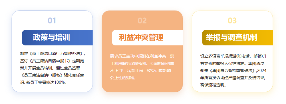 集团制定《反贿赂腐败政策》,明确细化贿赂腐败行为的具体情况,并设定检举和监督渠道确保商业活动的廉洁性。